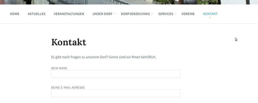 Auf Deiner Dorfpage ist ein Kontaktformular installiert. Dies findest Du unter dem Menupunkt Kontakt. Damit Nachrichten nicht ins Leere laufen, muss für das Kontaktformular eine oder mehrere E-Mailadressen hinterlegt sein.