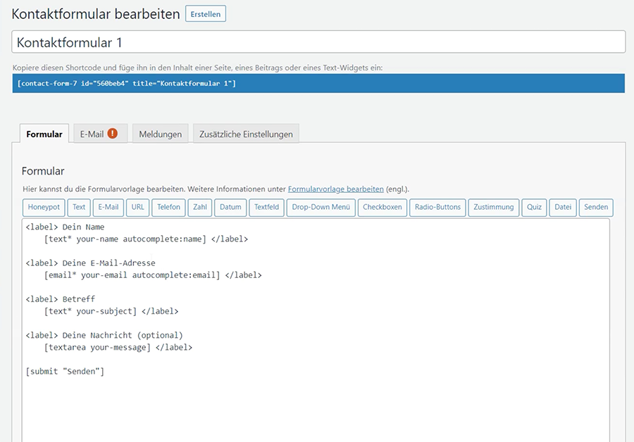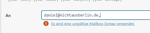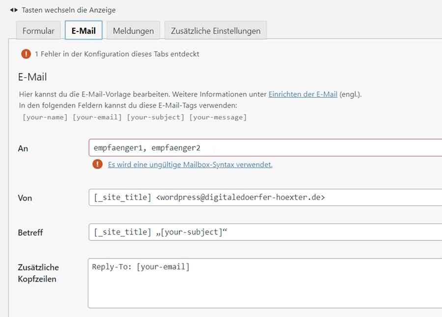 Gehe auf den Reiter E-Mail. Hier kannst Du im Textfeld An: Die E-Mailadressen angeben, an die gleichzeitig eine Nachricht aus dem Kontaktformular gesendet werden soll. Trenne mehrere E-Mailadressen stets durch ein Komma.