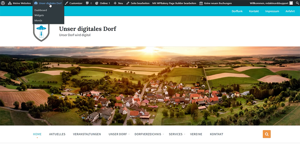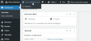 Wenn Du auf die Option Zur Website klickst, wechselt das Backend mit dem Dashboard zur Ansicht Deiner Website, dem sogenannten Frontend, und Du kannst so die Website sehen, wie sie andere Besucher im Internet sehen. Nutze die Option, um Anpassungen nach Bearbeitung und Aktualisierung zu kontrollieren.