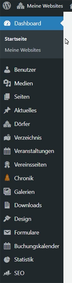 In der Seitenleiste findest Du verschiedene Menupunkte, wie z.B. alle Deine Seiten, Beiträge etc. Die Ansicht der Optionen variiert hier ggf., wenn Dir eine bestimmte Rolle, wie z.B. Redakteur zugewiesen ist.