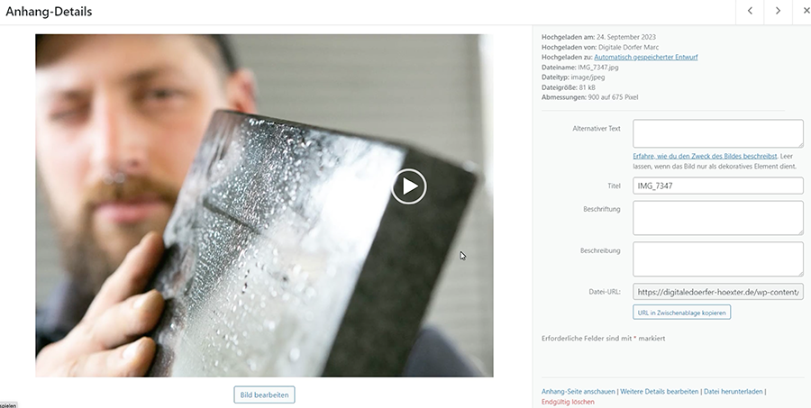 Klickst Du auf eine Datei in der Mediathek, dann erscheinen weitere Informationen zu der Datei. Hier kannst Du z.B. auch eine Beschreibung hinzufügen, die dann unter dem Bild auf der Website sichtbar wird. Den Dateinamen kannst Du ebenso anpassen. Der Alternativtext sollte das Bild und die Situation im Bild beschreiben. Sehbehinderte nutzen diese Angaben, um Informationen über Bilder auf einer Website zu erhalten. Ein Bild kann hier an der Stelle auch aus der Mediathek gelöscht werden.