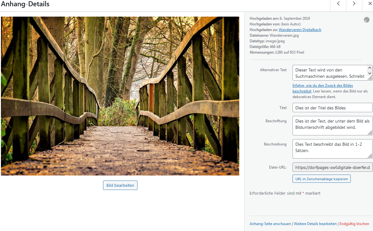 Verwende sinnvolle Dateinamen, die nicht zu lang werden. Beispiel: holzbruecke-dorfwald.jpg