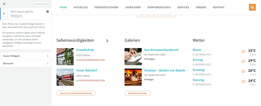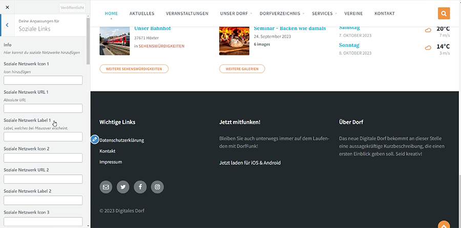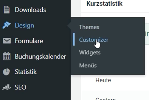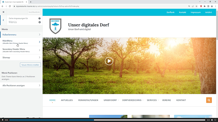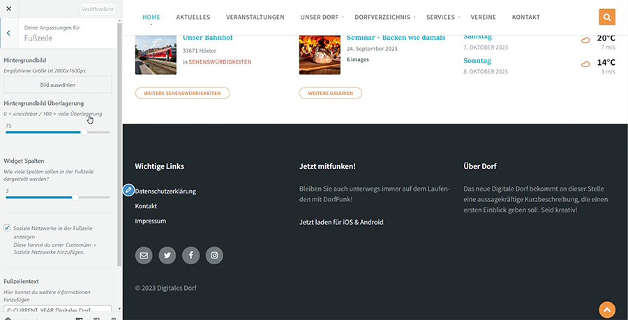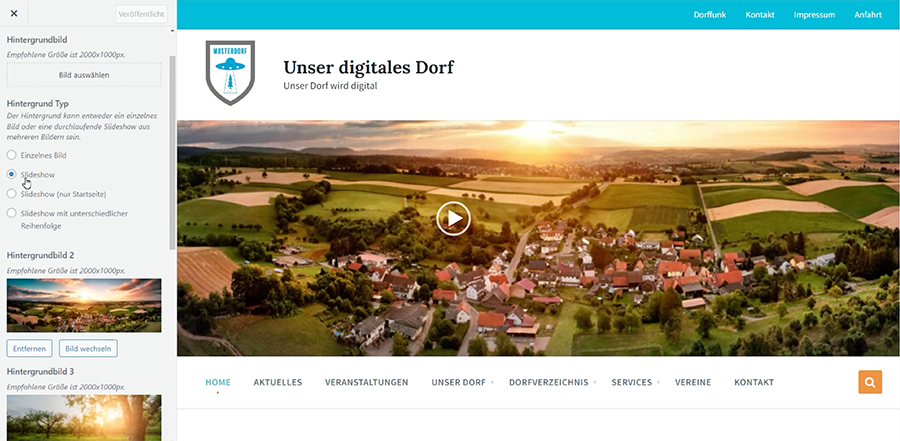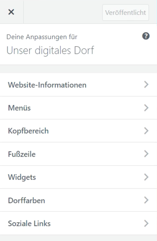 Über den Customizer Deiner Dorfpage kannst Du bestimmte Anpassungen im Design und Layout selber verändern. Wähle im Backend Deiner Dorfpage im Menu Design und den Punkt Customizer aus.