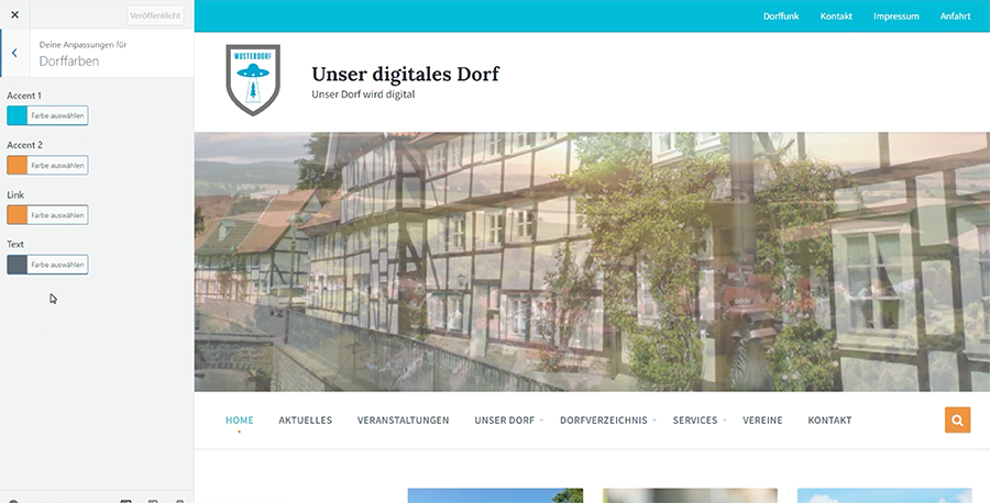 Du kannst das Farbthema Deiner Dorfpage anpassen.