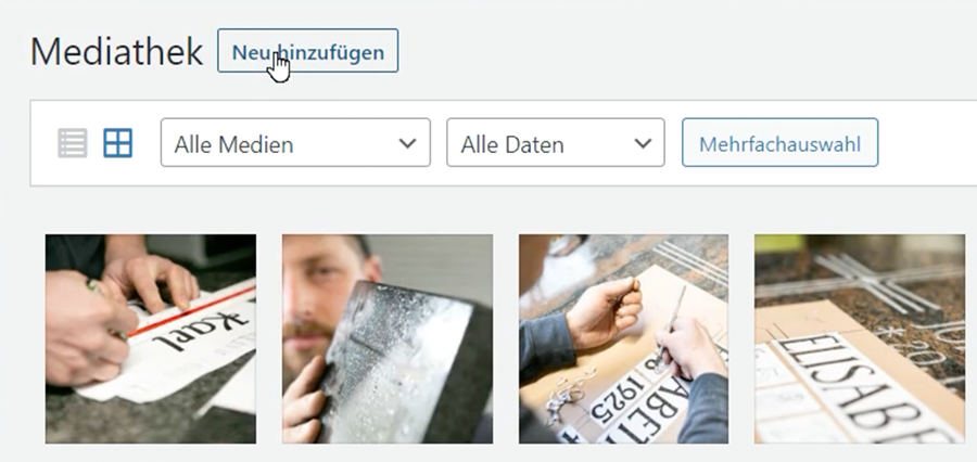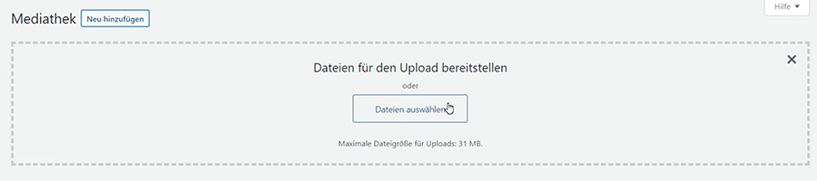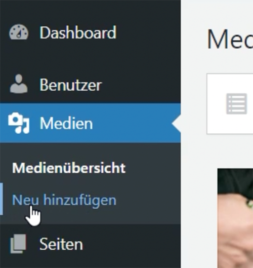 Über das Seitenmenu kannst unter dem Punkt Medien und die Option Neu hinzufügen, neue Medien in die Mediathek laden.