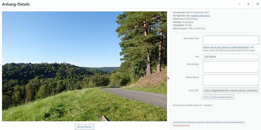 Wenn Du ein neues Bild hochgeladen hast, kannst Du es nun in der Mediathek auswählen und hier direkt in der Mediathek Anpassungen vornehmen. Du kannst eine Beschreibung hinzufügen, die später unter dem Bild angezeigt wird. Ebenso kannst Du den Titel der Datei verändern, um später die Suche in der Mediathel effektiver nutzen zu können. Bearbeite das Bild nachträglich. Klicke dazu auf den Button Bild bearbeiten, den Du unter dem Bild angezeigt bekommst.