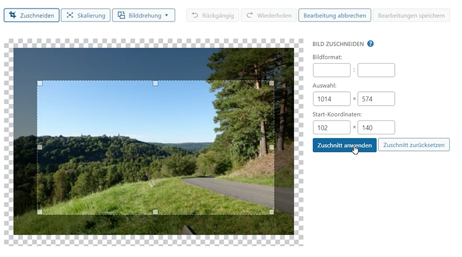 Mit der Option Zuschneiden kannst Du nun den Bildausschnitt noch verändern. Du speicherst die neue Version in der Mediathek ab, indem Du auf Zuschnitt anwenden klickst.