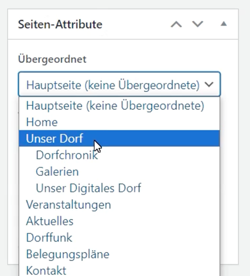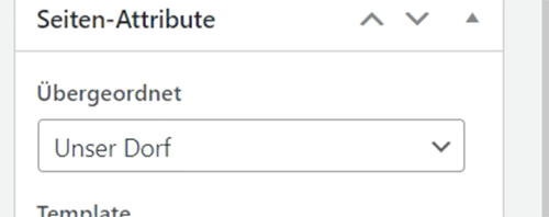 Rechts unter Seiten-Attribute wählst Du nun eine Seite aus, die dieser neuen Seite auf der Dorfpage übergeordnet sein soll.