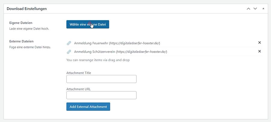 Hier siehst Du nun, dass bereits zwei Dateien als Download bereitgestellt werden. Klicke nun auf den Button Wähle eine Datei, um eine weitere Datei als Download bereit zu stellen.