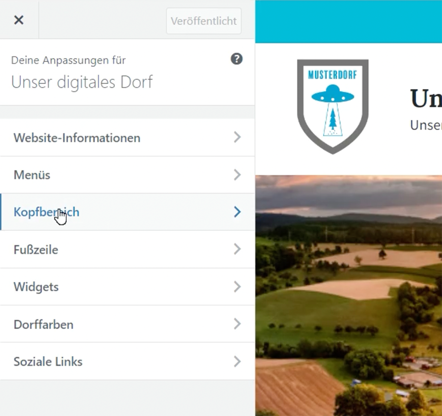 Über das Seitenmenu gelangst Du über Design auf den Customizer. Im Customizer-Menu klickst Du auf den Punkt Kopfbereich um diesen zu öffnen.