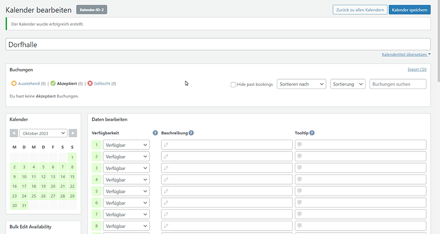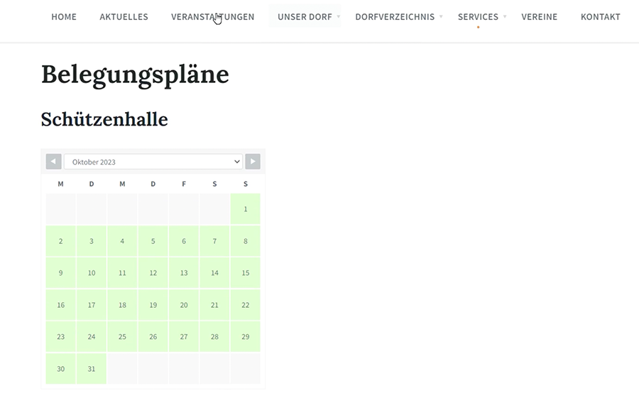 Auf Deiner Dorfpage kannst Du für bestimmte Bereiche Buchungskalender anlegen, die dann auf der Dorfpage so wie im Beispiel abgebildet werden..