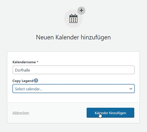 Nachdem Du auf den Button geklickt hast, wird Dir folgendes Fenster angezeigt. Vergib hier den Namen für den neuen Kalender. Darunter kannst Du auswählen, ob Du den neuen Kalender aus einem bereits bestehenden Kalender dublizieren möchtest, oder einen ganz neuen Kalender anlegen möchtest. (Dublizieren kann dann sinnvoll sein, wenn Du viele Einstellungen aus einem bestehenden Kalender übernehmen möchtest.) Klicke dann Kalender hinzufügen.