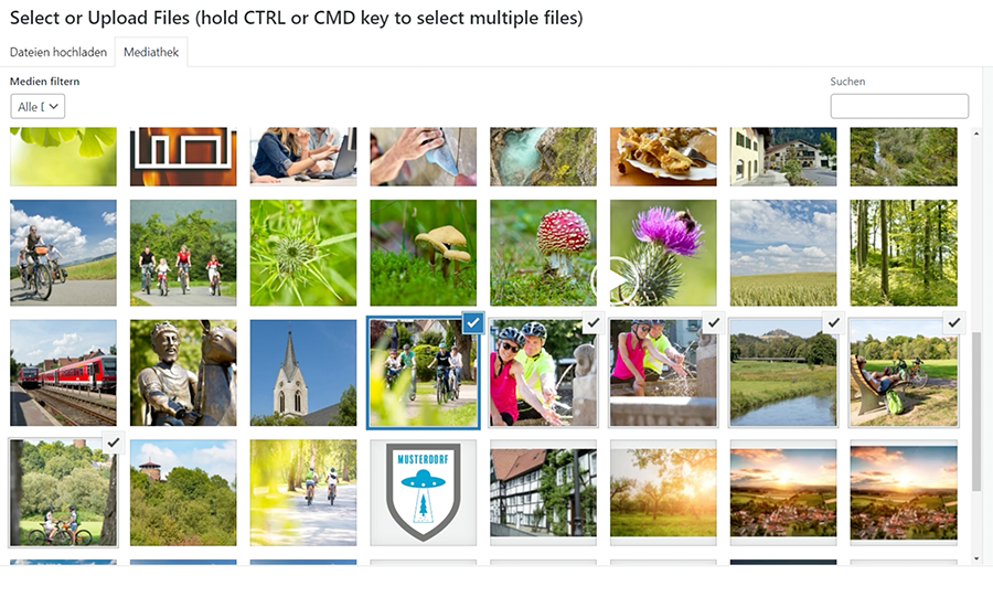 In der Mediathek siehst Du nun durch den kleinen Haken am Bild, welche Bilder alle für Deine Galerie ausgewählt wurden.