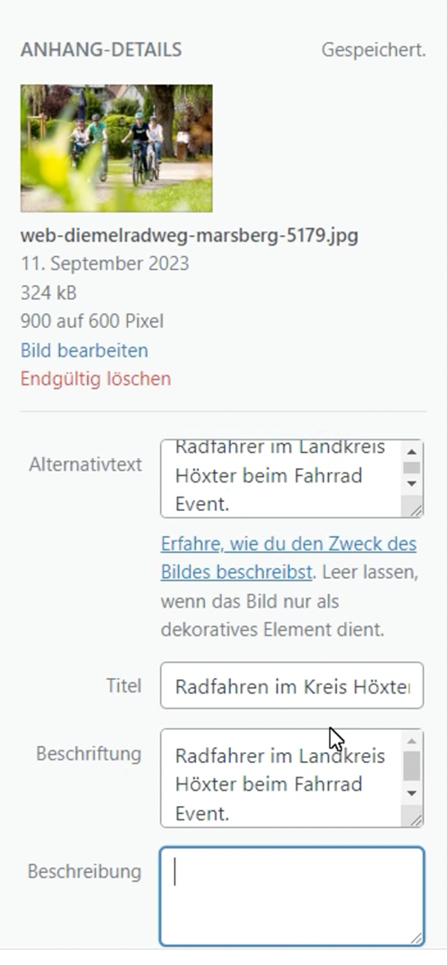 Wenn Du ein einzelnes Bild nun anklickst, wirst Du rechts in der Galerieansicht einige Parameter für dieses Bild sehen. Zudem findest Du einige Textfelder zu Alternativtext, Titel, Beschriftung und Beschreibung. Diese sind relevant für die Auffindbarkeit von themenbezogenen Inhalten.