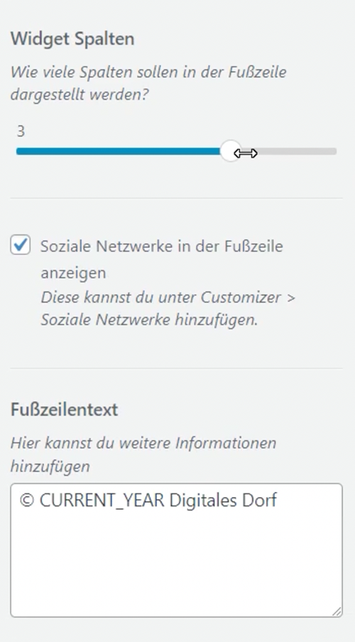 Nun kannst Du auch auf weitere Optionen zugreifen. Mit dem Schieber kannst Du die Anzahl der Spalten für Widgets anpassen. Ebenso kannst Du festlegen, ob die Icons für Social Media angezeigt werden sollen.