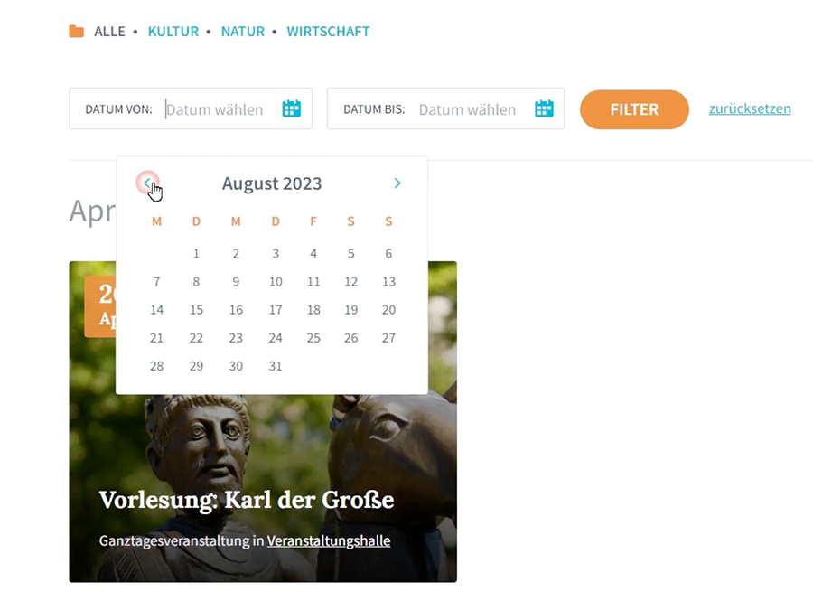 Um vergangene Veranstaltungen noch einmal ansehen zu können, kannst Du die Filterfunktion oberhalb der Auflistung nutzen. Gib hier ein Datum oder einen Zeitraum in der Vergangenheit an, in dem Dir dann abgeschlossene Veranstaltungen noch einmal angezeigt werden.